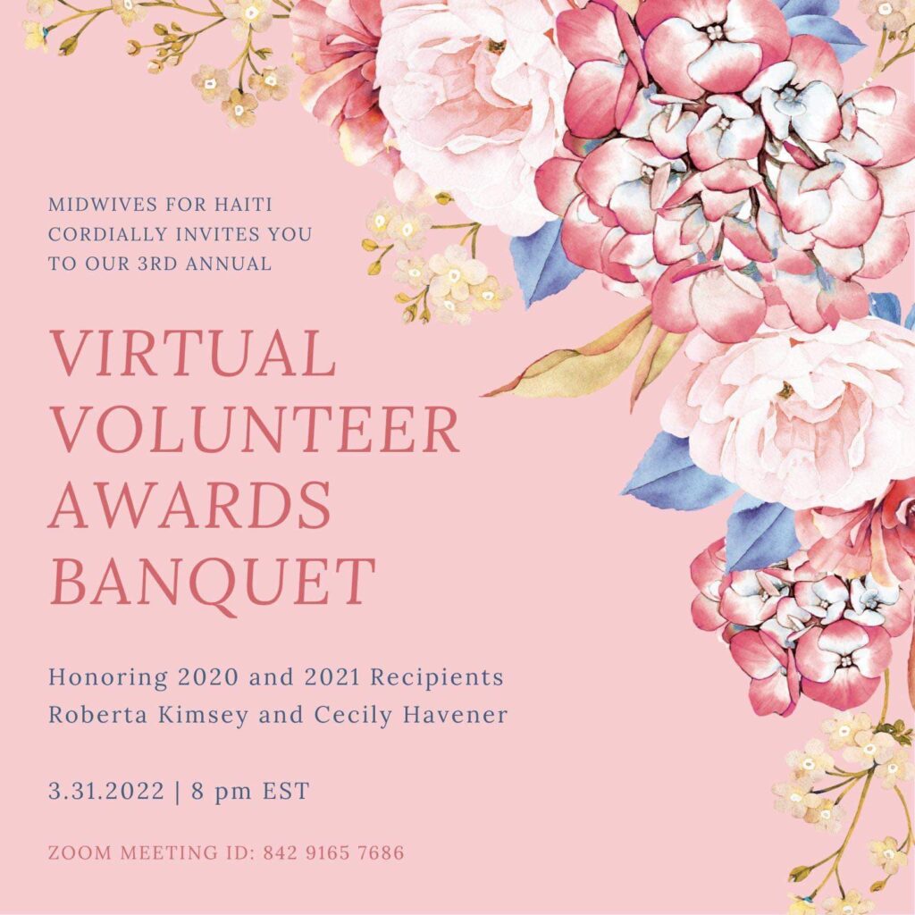 A special Zoom will be held March 31st, 2022 at 8 pm Eastern time. Please join us in celebrating these two very special friends of Midwives for Haiti.