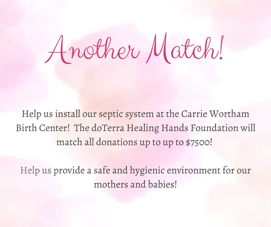 And if you didn’t quite get around to donating, I have very exciting news! The doTerra Healing Hands Foundation has generously given us a matching grant opportunity with the specific goal of funding the septic tank at the new Carrie Wortham Birth Center. The Foundation will match up to $7423, and we have until 31 January to collect these funds.